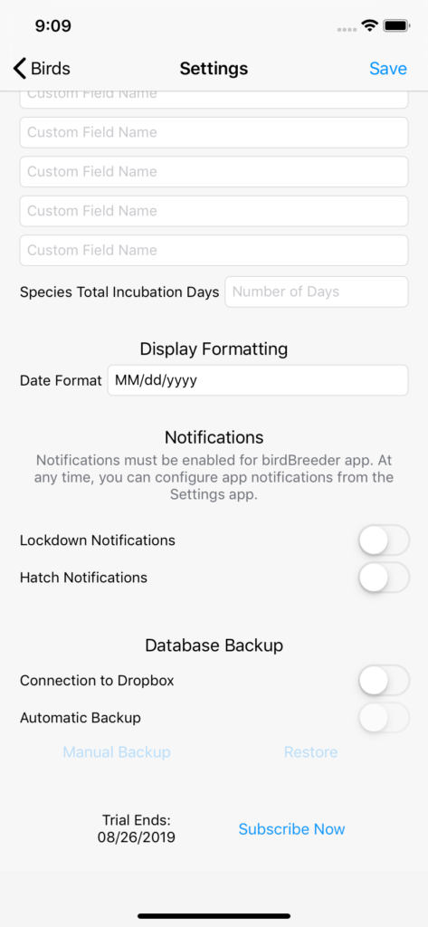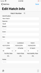 - Calculate hatch dates automatically! Save the number of days for incubation by species in Settings to have lockdown and hatch dates automatically calculated when you enter set dates for those species.